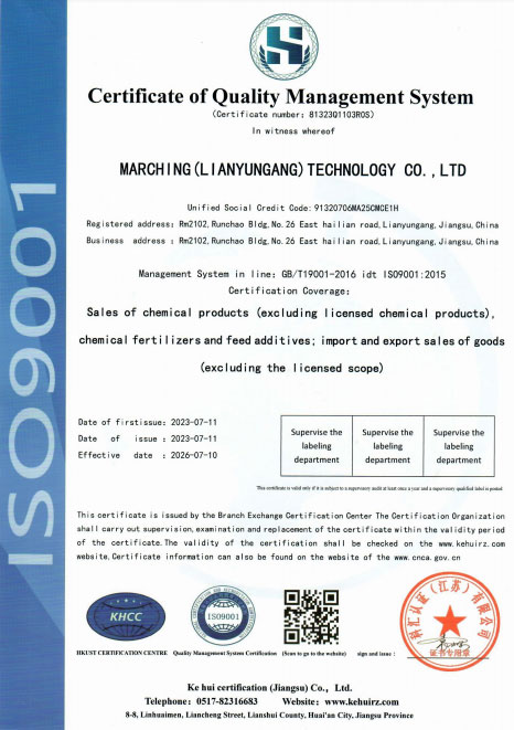 Marching(Lianyungang) technology Co., Ltd,the company is located in Lianyungang, China, a beautiful seaport city, the intersection of One Belt And One Road . The company specializes in chemicals international trade,and we mostly focus on fertilizers bsuiness. Our main products are Ammonium chloride Agri-grade and tech-grade,Ammonium sulphate,Soda Ash,sodium sulphate anhydrous,sodium bicarbonate,Etc.The cargoes are mainly sold to Vietnam,Malaysia, Thailand, Philippines, Indonesia, South Korea, India, Pakistan and some other countries.